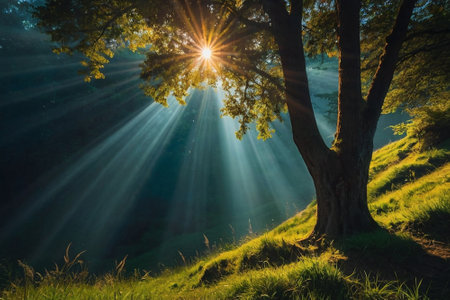 Magical sunbeams filter through the lush green foliage of a tranquil forest