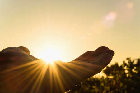 The sun through the palm of your hand. The rays of light at sunset penetrate through your fingers. Simple picture with a hand. Calm background. Beauty is here and now. Male hand.