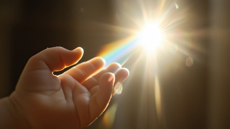 Light beams shining through a hand in a serene indoor setting during the afternoon