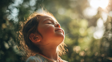 A young girl stands outside with her eyes closed soaking in the warmth of the sun. She looks peaceful and content in a green natural environment surrounded by trees.