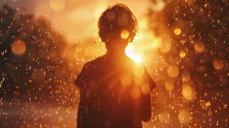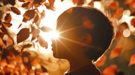 A child stands in silhouette, surrounded by colorful autumn leaves, as sunlight creates a glowing effect around their profile. The warmth of the season enhances the scene.