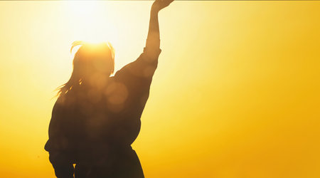 A high quality silhouette photograph showing woman reaching up at sunset silhouette during a dramatic sunset. The scene captures emotion, lifestyle, freedom and calm atmosphere, making it suitable for commercial stock use such as travel, lifestyle, inspiration, mindfulness, and nature-related concepts.