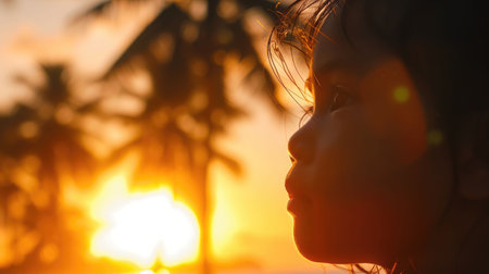 The silhouette of a womans face against a colorful sunset with palm trees and a beautiful natural landscape. Her gesture exudes happiness and peace as the heat of the day gives way to darkness AIG50