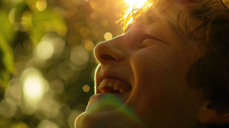 The close up picture of the person is smiling and happy that surrounded with the nature under the bright light from the sun, the feeling of the freshness that surrounded with the green nature. AIG43.