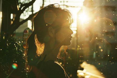 An anonymous silhouette against a stunning sunset, creating a serene atmosphere with warm lighting and a bokeh effect. Trees and buildings add depth to the tranquil scene.
