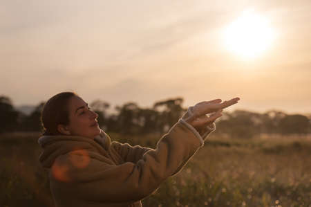 A young woman basks in the warmth of setting sun eyes closed savoring tranquility of nature.