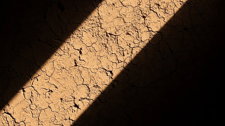 A close-up view of cracked earth texture with a strong diagonal beam of sunlight casting a deep shadow across the surface.