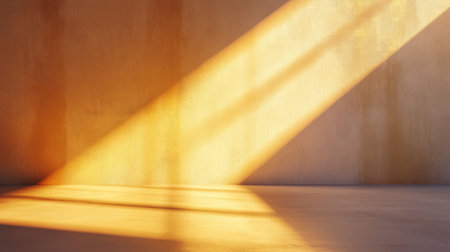 Sunlight casts gentle shadows across a minimalistic room with textured walls creating a warm and inviting ambiance. The scene captures a tranquil moment during golden hour.