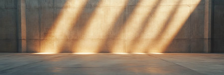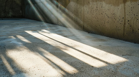 Soft light rays penetrate through an empty space, casting intricate shadow patterns on a textured concrete surface, creating a tranquil atmosphere.