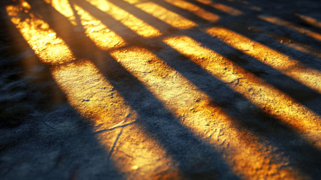 Captivating diagonal patterns of sunlight create dynamic shadows on a textured surface, highlighting natural contrasts. Ideal for art or design themes.
