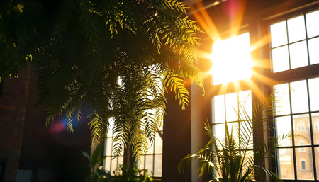 Sunshine pours into a tranquil room through a large window, casting warm light on the floor and highlighting indoor plants in pots. The atmosphere radiates comfort and serenity.