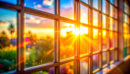 Golden sunset rays stream through a multi-paned window with colorful reflections and bokeh.