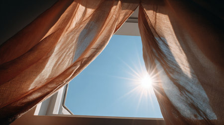 Sunlight illuminates a room as it shines through an open window, with soft curtains dancing in a gentle breeze, creating a serene atmosphere.