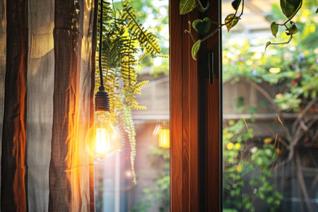 Cozy light filters through lush greenery and a sheer curtain, creating a warm, tranquil ambiance in this intimate setting. Perfect for those seeking a touch of nature. Generated A.I.
