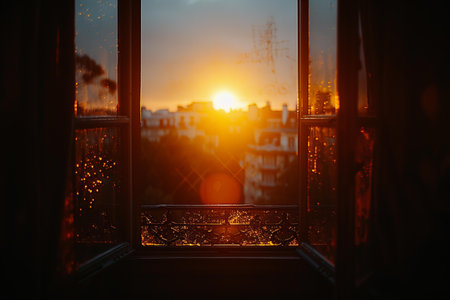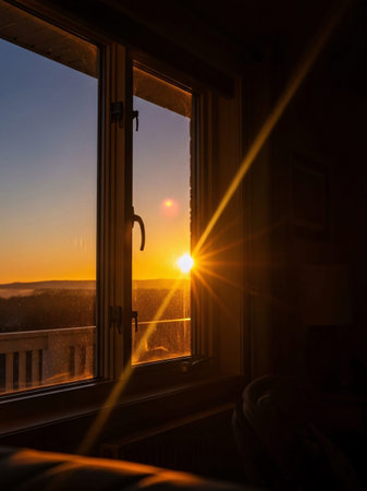 A beautiful sunset view through a window, highlighting dust particles dancing in the light. This serene scene captures a moment of tranquility and natural beauty.