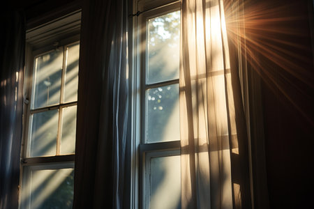 Warm evening sunbeams filter through a white curtain and window
