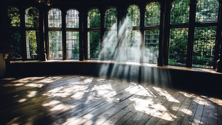 An interior shot features light pouring through arched windows onto a wooden floor. The scene showcases natural light and shadows, creating a dynamic visual effect. It suggests a building's interior, likely a room with a decorative architectural style. Suitable for various design, historical, or conceptual uses.