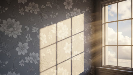 A serene indoor scene showcasing sunlight streaming through a window, illuminating the space with soft rays and gentle shadows, creating a tranquil ambiance.