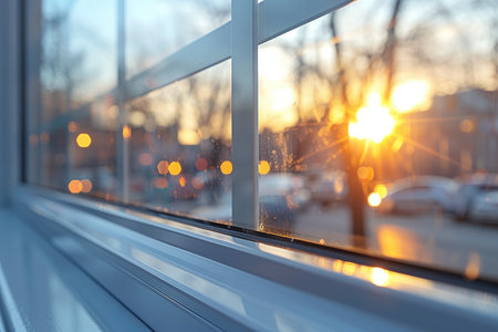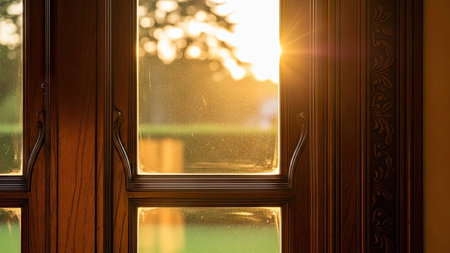 Gentle sunlight filters through spotless glass, casting a warm glow as a softly blurred outdoor scene evokes serenity and tranquility during the golden hour.