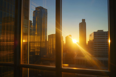 Golden sunrise shines through modern office windows overlooking urban city skyline with high rise buildings in early morning.