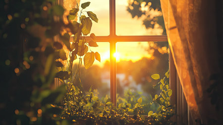 A beautiful sunset seen through a window, with lush greenery framing the scene. Soft light filters in, creating a peaceful atmosphere perfect for relaxation.