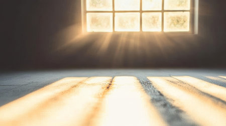 Sunlight streaming through an old window, illuminating floating dust particles in a dark, moody room