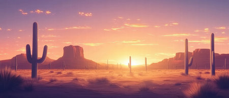 Cinematic desert landscape at sunset featuring vibrant colors and towering cacti