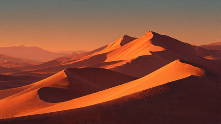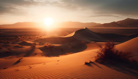 Majestic desert sunset, golden light illuminating dunes and mountains.