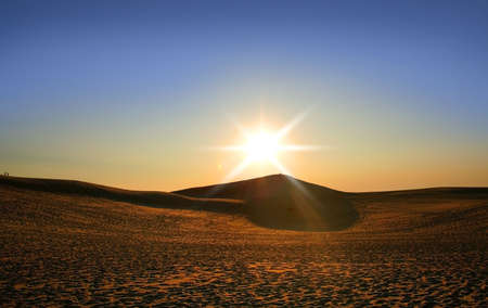 Lonely sand dunes under amazing evening sunset sky at drought desert landscape. Global warming concept