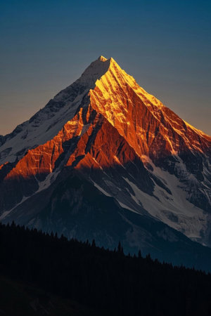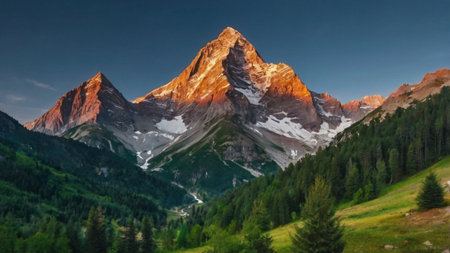 Sunlit mountain peak with snow and forest under a clear sky