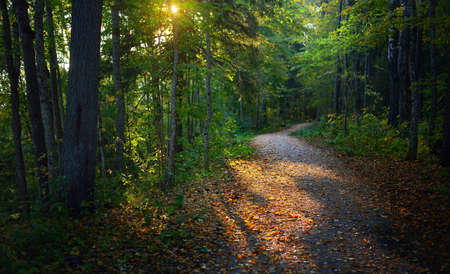 Path in the forest at sunset. Beautiful summer landscape with sun rays