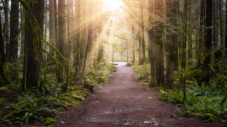 Beautiful Path in the Rainforest during a wet and rainy day. Lynn Canyon Park, North Vancouver, British Columbia, Canada. Nature Forest Background. Art Render