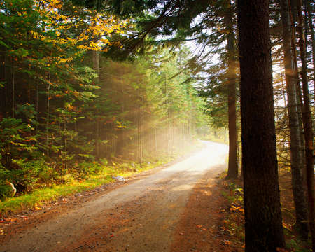 Path in the autumn forest with sun rays passing through the trees.