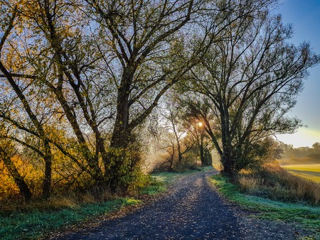 a black path, green grass, black trees, a blue sky and the golden sun rising trough the trees