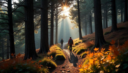 Hikers walking through sunlit forest trail in autumn season