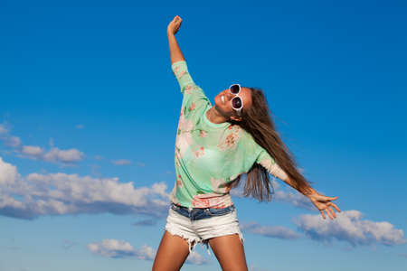 Beautiful woman on sunny day blue sky. Female power. Summer fashion. Find inner strength