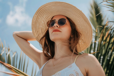 The woman confidently poses in a stylish summer outfit, embracing the sunshine while surrounded by palm trees and blue skies.
