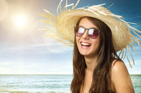 Pretty young girl smiling with staw hat and sun glasses in the beach