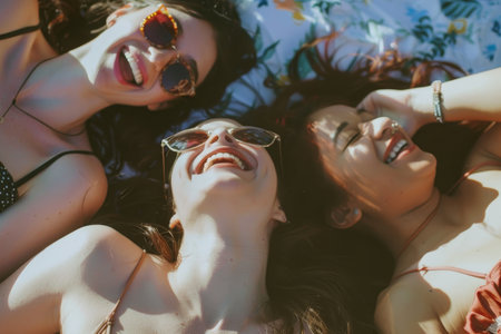 Three beautiful cheerful women are relaxing together on a beautiful sunny day
