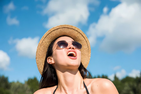 Summer Bliss Woman with Hat and Sunglasses Under Blue Sky