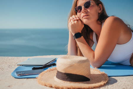 Digital nomad, woman in the hat, a business woman with a laptop sits on the rocks by the sea during sunset, makes a business transaction online from a distance. Freelance, remote work on vacation.