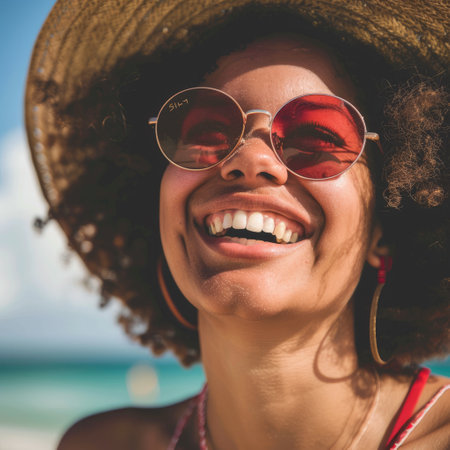 A happy woman in a sun hat and sunglasses is smiling on the beach, enjoying the sun and having fun while on a travel adventure AIG50