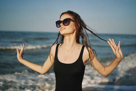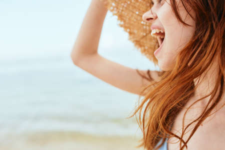 Beautiful young woman raises her head towards the sun to enjoy the heat in summer, with the beach and blue sky in the background.