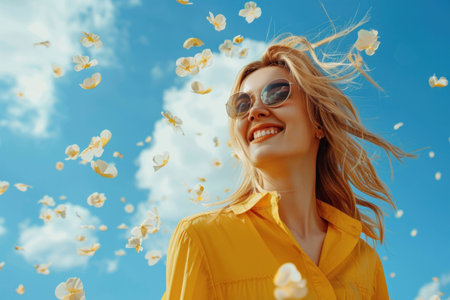 A cheerful woman in yellow shirt smiling against a blue sky with floating flower petals around her