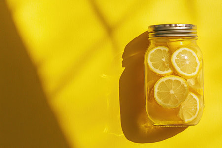 Lemon slices in glass jar on bright yellow background with sunlight creating bold shadows. Fresh citrus fruit summer drink concept.