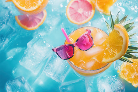 A bright beverage topped with citrus fruits and a straw sits on ice, surrounded by slices of orange and pink grapefruit in summer.