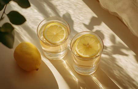 Two clear glasses filled with lemon infused water rest on a table, illuminated by warm afternoon sunlight casting soft shadows. Bright lemon slices float on top.