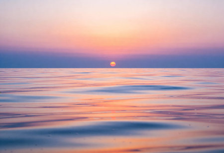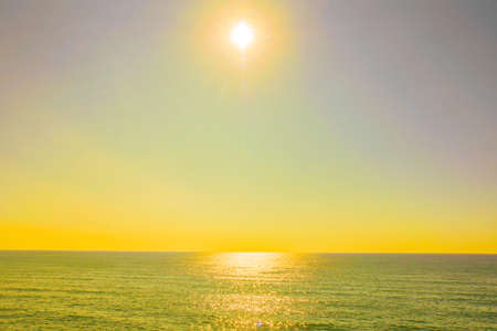 Bright sunlight touches the horizon during sunset over the calm ocean waters, creating a warm and tranquil atmosphere