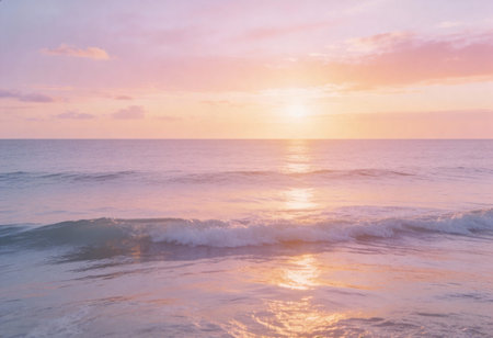 A breathtaking sunset view over gentle ocean waves, featuring a soft pink sky and wispy clouds, creating a tranquil atmosphere perfect for relaxation and nature lovers.