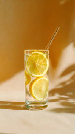 A tall glass filled with lemonade and fresh lemon slices sits against a warm, soft background. A straw adds to the inviting look of this refreshing drink in bright sunlight.